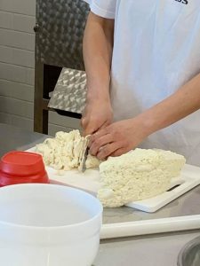 朝早くに搾乳されたミルクを、温度管理によってホエー(清乳)とカード(乳のタンパク質と脂肪分を多く含んだ凝固物)に分離させ、そのカードを細かく刻んだら、熱湯を加えて折りたたむように滑らかにかき混ぜていきます。