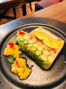 定番の『彩り野菜のテリーヌ』今のソースはパイナップルとフジマル東心斎橋産のミントの初夏の爽やかなソース。