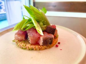 旬の桜鱒はハーブマリネにして旨味たっぷりなドライトマトと食感愉しいクスクスとジョイン。
