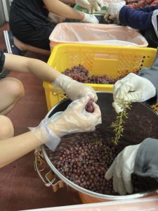 ワインの造り方の説明から始まり、手でぶどうの実を軸から外して、バケツいっぱいに貯まったら手動のバスケットプレスに入れて圧搾。