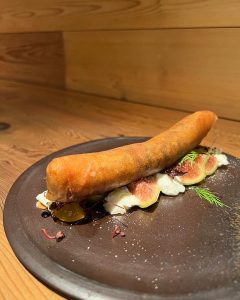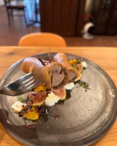 『白レバーのオイルコンフィとレンズ豆のパートブリック いちじくとカラマンシーのサラダ添え』